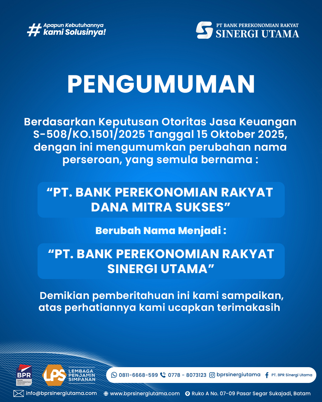 BPR Dana Mitra Sukses hadir sebagai solusi bagi masyarakat kota Batam dengan berbagai produk simpanan dan pinjaman yang kami tawarkan. Proses mudah dan cepat, bunga bersaing, serta ditangani oleh professional.